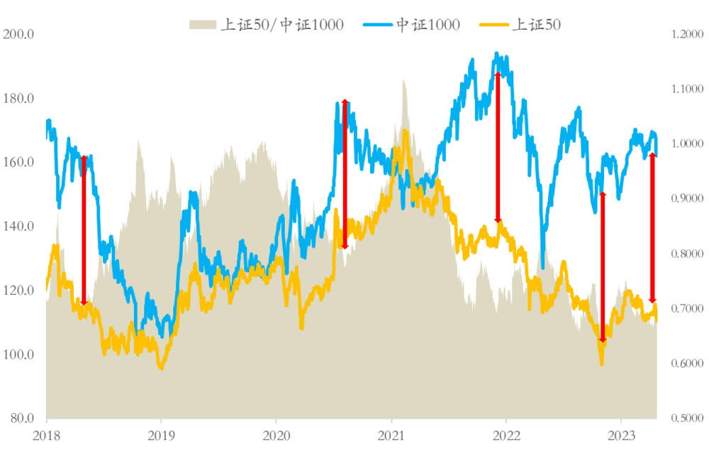 上证50和中证1000指数的相对比价(以下简称大小比价)可以作为这种再平衡的一个核心指标。