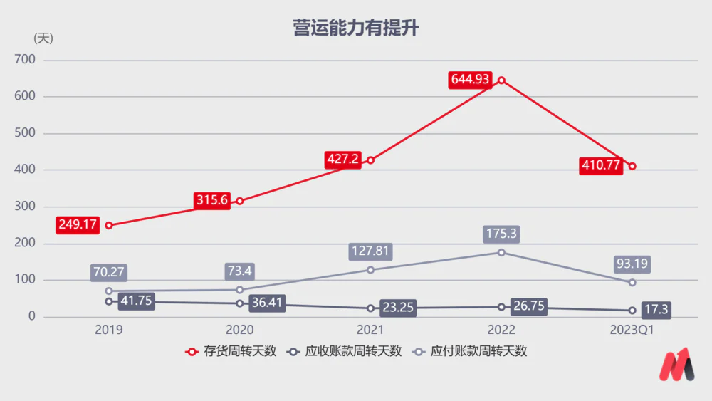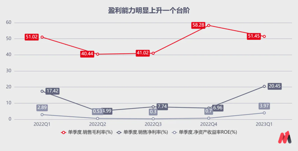 另外,一季度销售毛利率为51.45%,环比2022Q4有所下降。不过销售净利率随着高档白酒占比提升增至20.45%,净资产收益率提升至3.97%,盈利能力变强了。
