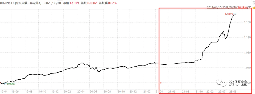 以前述东兴兴福一年定开债券基金为例,自从他接任后,除了2022年4季度市场明显调整的时期外,基金净值几乎没有明显的调整。而且,近1年涨幅几乎是同类平均的2倍(以A类计,截至6月30日)。
