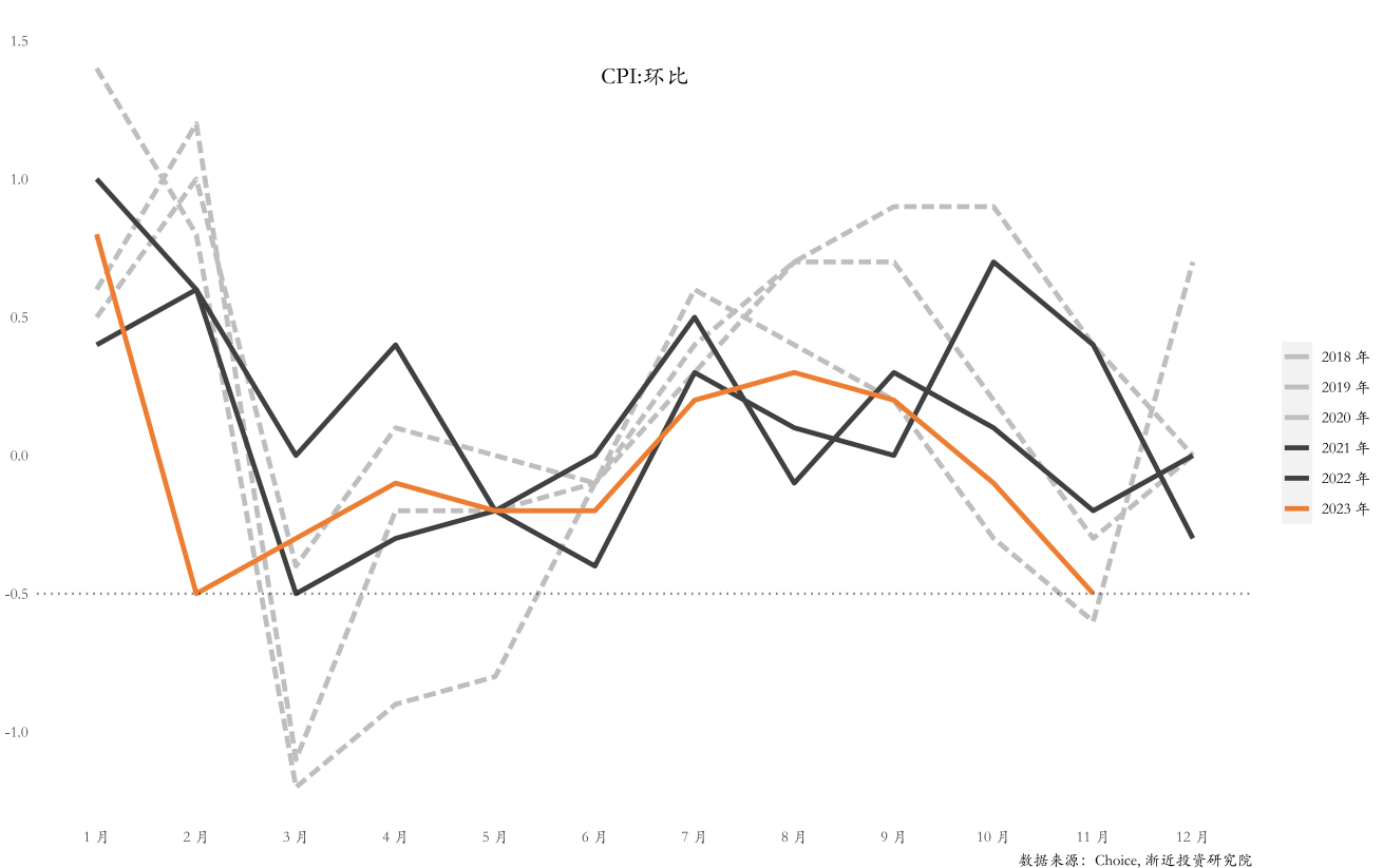 在10月的时候我们已经提示过大家经济已经进入“底部震荡”中阶段性向下的部分,后续无论是金融数据还是通胀等经济数据表现都不会太好。因此11月数据的趋势早已经可以判断,现在顶多就是幅度有些超预期。本月CPI的回落其实有很多是非内需因素影响导致的,相比于新低的CPI,大家应该更加关注出现回落趋势的PPI。