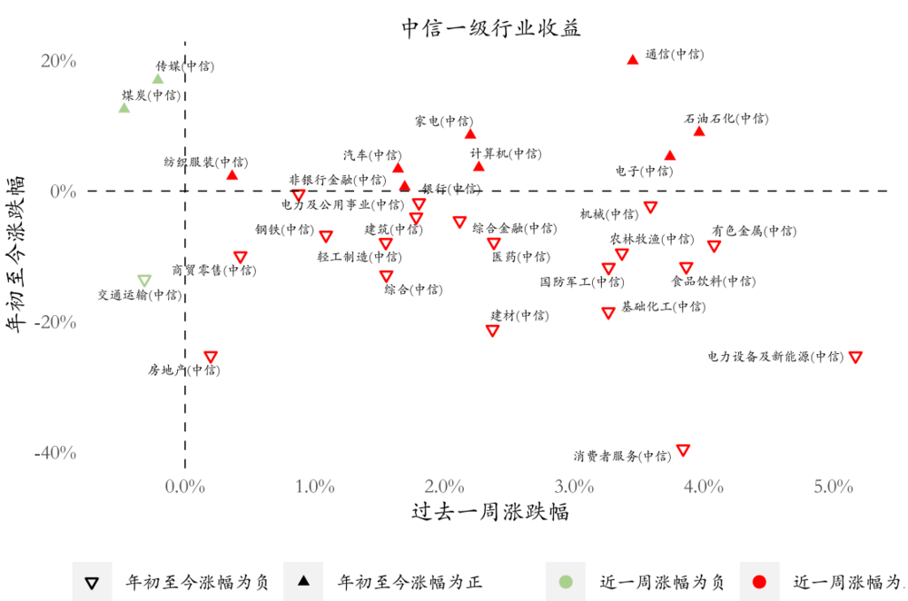 细分来看,本周行业指数中27个行业上涨,3个行业下跌。排名前5的行业分别为电力设备及新能源(5.17%)、有色金属(4.08%)、石油石化(3.97%)、食品饮料(3.87%)、消费者服务(3.84%)。所有行业中排名最后的5个行业分别为煤炭(-0.47%)、交通运输(-0.31%)、传媒(-0.21%)、房地产(0.20%)、纺织服装(0.36%)。