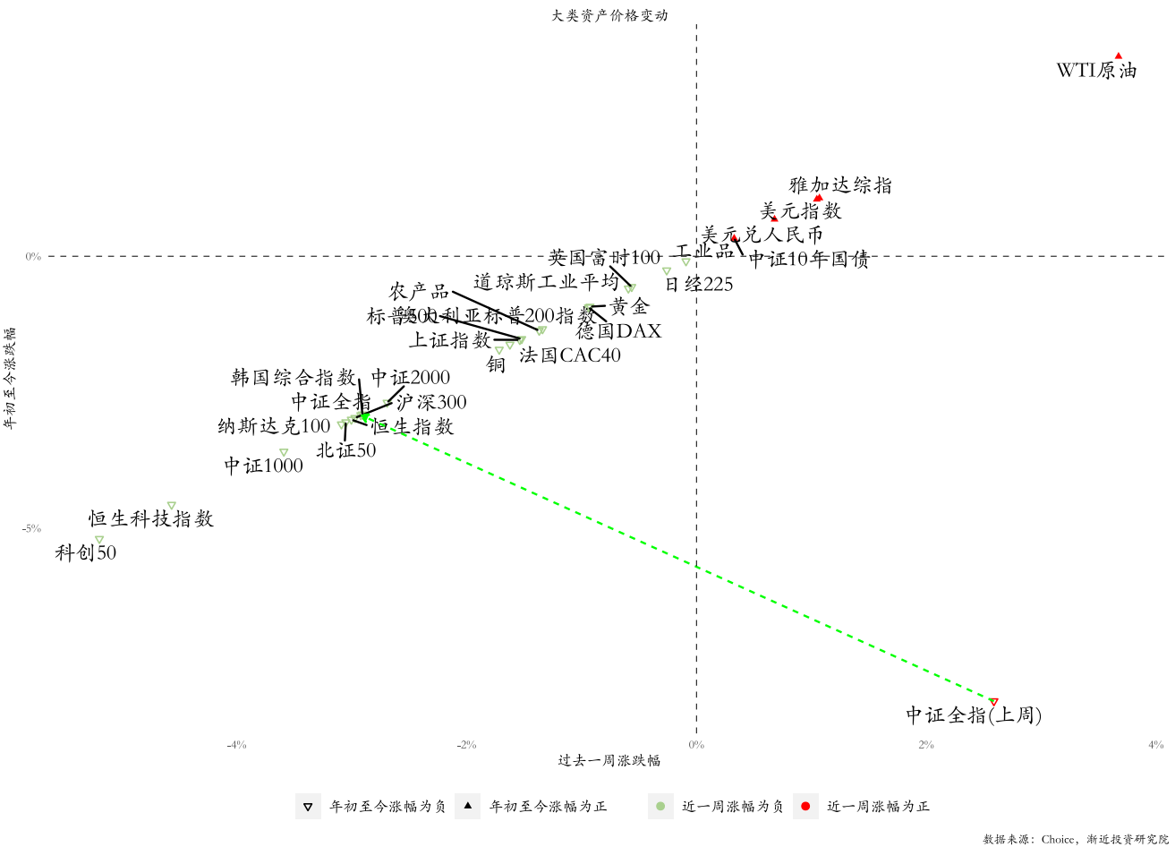 本周市场(中证全指)回落,主要指数跌回节前反弹开始点位。上周日统计局公布的12月PMI显示基本面仍弱,并没有明显好转,节后市场下跌幅度明显。新的一年开始后,各主要资产的年初至今涨幅重置归0,重回同一起跑线。境外主要资产除了原油、美元指数等少数品种外都出现了明显的下跌。