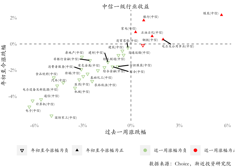 细分来看,本周行业指数中6个行业上涨,24个行业下跌。排名前5的行业分别为煤炭(5.63%)、电力及公用事业(2.00%)、石油石化(1.32%)、银行(0.79%)、钢铁(0.74%)。所有行业中排名最后的5个行业分别为电子(-6.32%)、计算机(-6.11%)、通信(-5.59%)、国防军工(-4.94%)、食品饮料(-4.80%)。