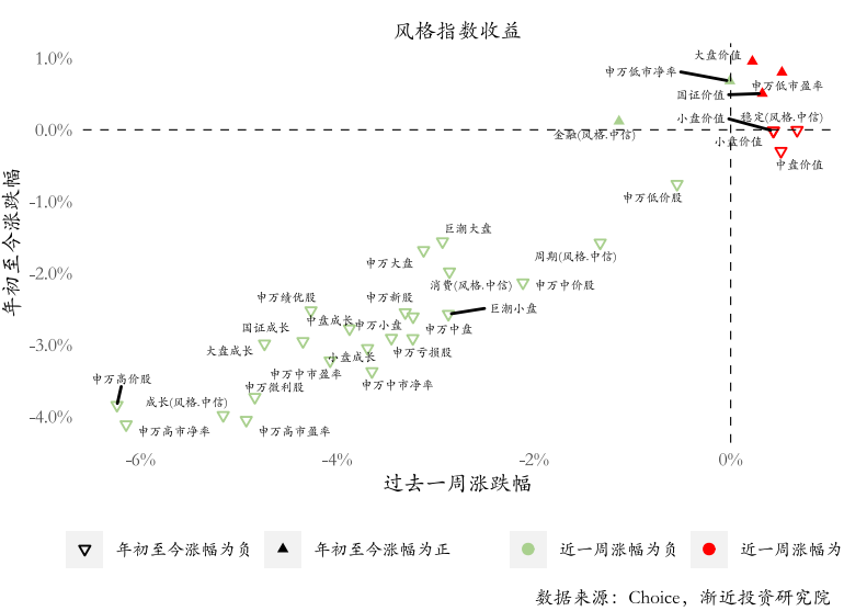 本周国证风格指数涨跌排序依次为中盘价值(0.51%)、小盘价值(0.43%)、小盘价值(0.43%)、大盘价值(0.22%)、小盘成长(-3.69%)、中盘成长(-3.87%)。本周中信风格指数涨跌排序依次为稳定(0.68%)、金融(-1.14%)、周期(-1.33%)、消费(-2.86%)、成长(-5.16%)。