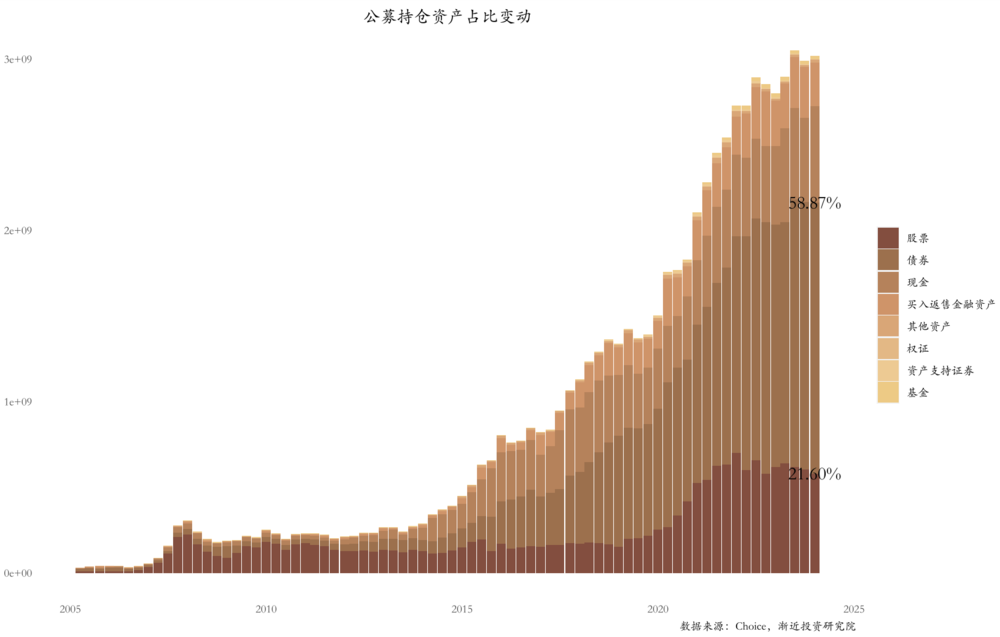 根据公募基金的四季报数据汇总,目前整个公募市场持有的各类资产净值总计26.8万亿,如果算上债券基金加杠杆的部分,资产总值高达30.2万亿,这其中有5.8万亿的股票、15.8万亿的债券,占比分别达到21.6%、58.87%。