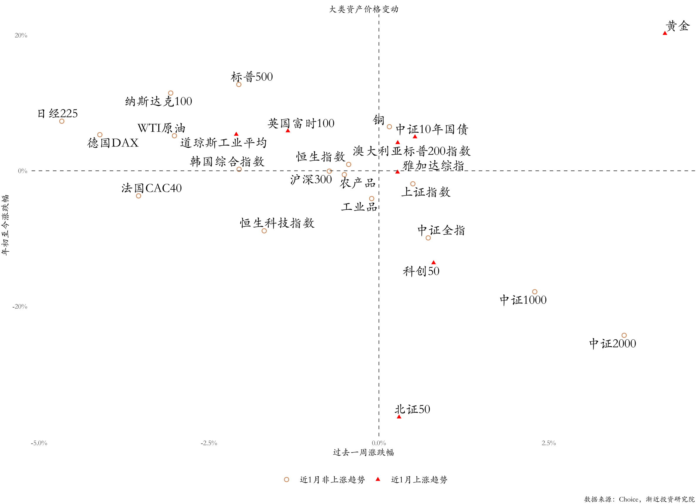 由于美国经济数据不及预期,海外衰退预期再起,海外资产中黄金领跑,日本等欧美发达国家主要股指出现明显下行,主要大宗商品价格同步下行。