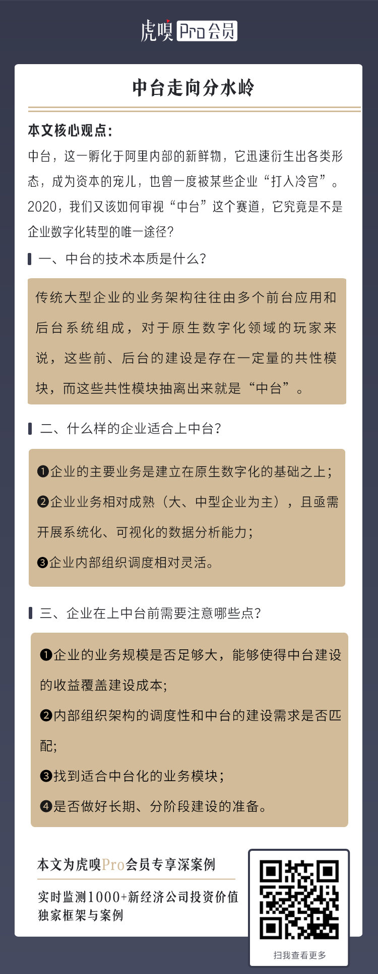 根据相关数据显示,2019年前三季度股权投资金额为4314.10亿元,同比下降53.7%,累计5461起投资案例,同比下降36.9%。在一级市场整体受募资难的大环境下,中台算是2019年投资圈为数不多的风口,并且这种风向在2020年仍在继续。