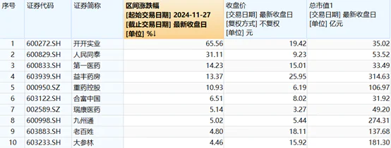 具体到上市公司层面,开开实业、人民同泰和第一医药的涨幅居前三位,涨幅分别为65.56%、31.11%及14.23%。