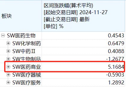 回顾自今年11月27日以来医药行业不同细分领域的涨跌幅情况,我们可以看到医药商业领域的区间涨幅(11.27-12.17)明显好于其他细分领域。