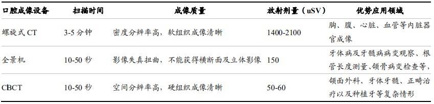 与全景机、传统螺旋CT相比,CBCT在口腔医疗应用中优势更加明显。