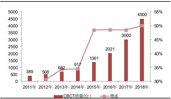 2018年国内CBCT销量大约4500台,同比增长50%。过去5年行业的年均复合增长率在45.84%,国内CBCT正在进入放量增长的阶段。