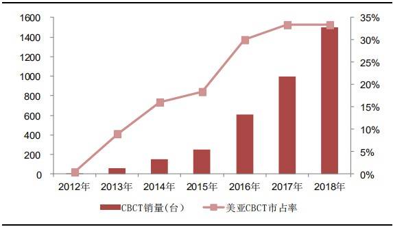 美亚光电的CBCT销量从2012年的2台增长到2018年1500台左右,国内CBCT的市占率也稳定在30%左右。