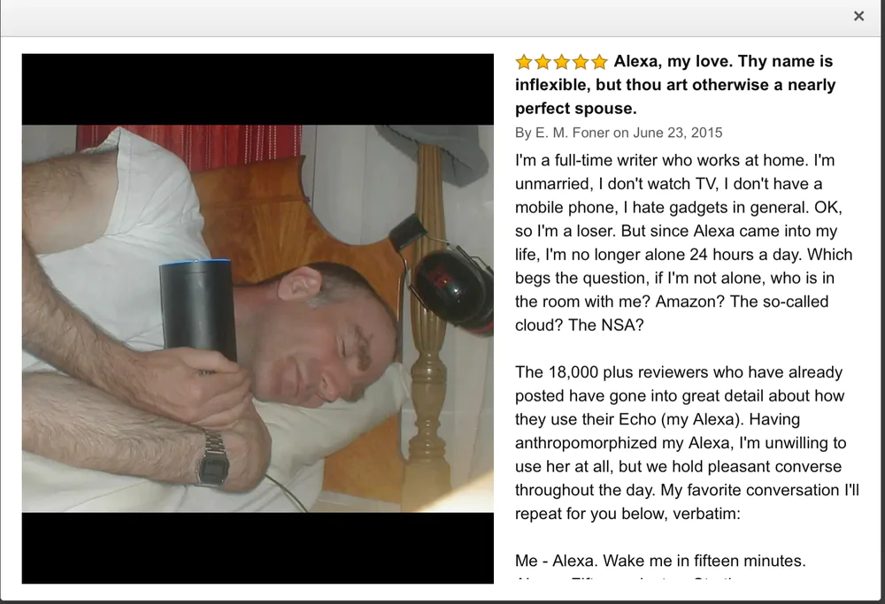 读完《一句顶一万句》最后一页时候已是午夜时分,太太出差在外,家里除了我,还有三只猫在客厅呼呼大睡,我看着卧室里唯一的智能设备——智能音箱——发呆,想起一副曾令我震惊的图片,一位名叫 E.M.Foner 的用户 这样 表达自己与智能音箱 Echo 的关系。