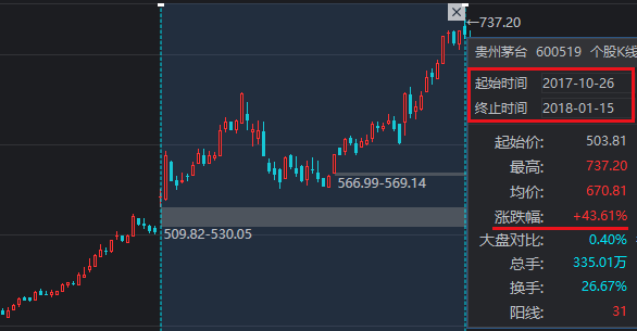 那么这种在业绩发布之后大涨的股票能不能追?比如贵州茅台在2017年10月25号发布了三季报,业绩同比增长60.31%,受此刺激,10月26号股价跳空大涨7.82%,从2017年10月26号统计到2018.1.15号,累计涨幅达到43.61%。但是,在此之前茅台2017年股价已经上涨90%,接近翻倍。追的话,存在被套的可能,不追吧,看着后续天天涨,心理的难受和懊悔真是难以言表。