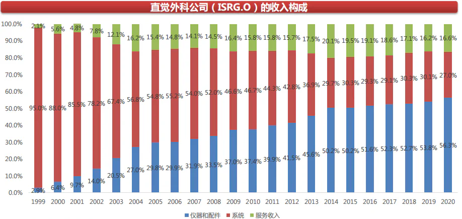 直觉外科的商业模式就很值得国内企业借鉴。公司目前以达芬奇机器人销售、耗材销售和维护服务形成闭环,具备持续增长的能力。公司的营业收入主要来自三部分: