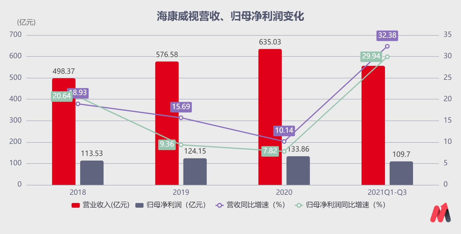 海康威视前3季度实现归母净利润为109.7亿元,同比增长29.94%。其主要原因为企业数字转型需求释放以及拓展新领域业务驱动营收增长,同时营业成本及费用可控。