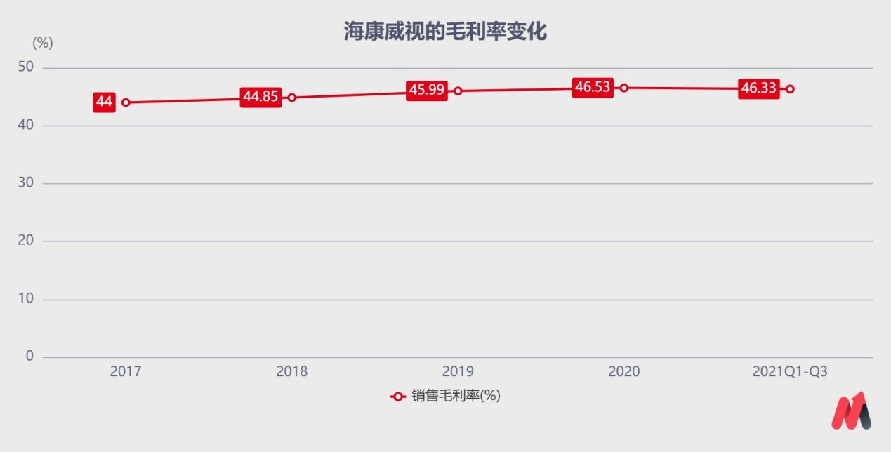 除了营收有所增长之外,海康威视的毛利率也较为稳定。在成本方面,受供应链紧张影响上游原材料价格上涨,公司适当调整产品价格,维持毛利率的稳定。说明公司虽然处于中游,但具有一定的议价能力。