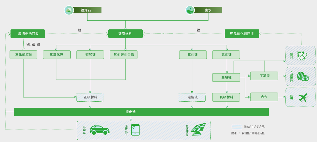 赣锋使用采购的负极材料、正极材料及电解液生产锂离子电池,主要用于电动汽车、各种储能设备及各种消费型电子设备,包括手机、平板、笔记本电脑、TWS耳机、无人机等。赣锋也正在积极推进固态锂电池的研发、生产和商业化应用。
