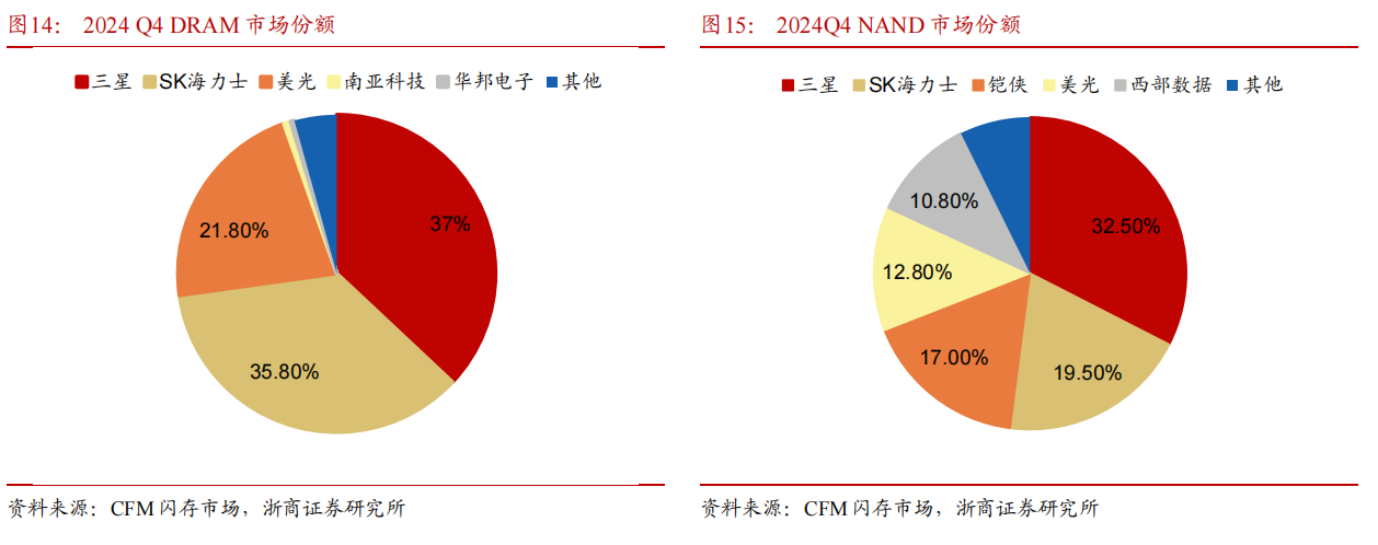 存储芯片因为缺货造成的涨价,叠加贸易摩擦,加速了国产替代的进程。存储是我国半导体行业非常鲜明的短板,无论是在晶圆制造环节,还是在解决方案环节, 海外厂商均占据了主要的市场份额。在晶圆环节,2024Q4 三星、海力士、美光、南亚科技以及华邦电子占据 95.7%的 DARM 市场份额,三星、海力士、铠侠、美光、西部数据等 top5 厂商占据 92.7%的 NAND Flash 市场份额。虽然目前国产化率只有 8%,国产替代空间巨大。
