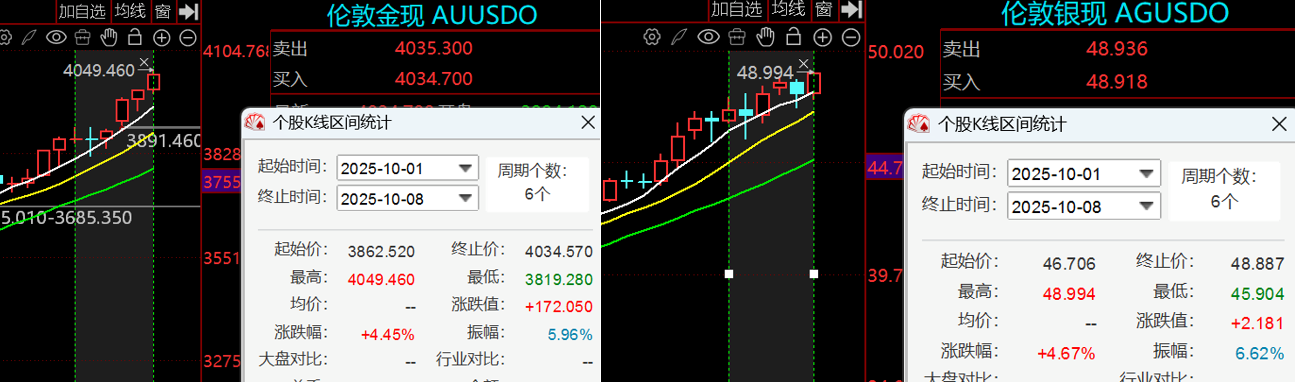 大宗商品大多上涨,金属涨幅居前。国庆期间大宗商品大部分上涨,贵金属和工业金属表现较好,金价一度突破4000美元关口,上涨3.4%,铜和白银上涨超2%。原油在大宗商品中领跌,跌幅超2%。