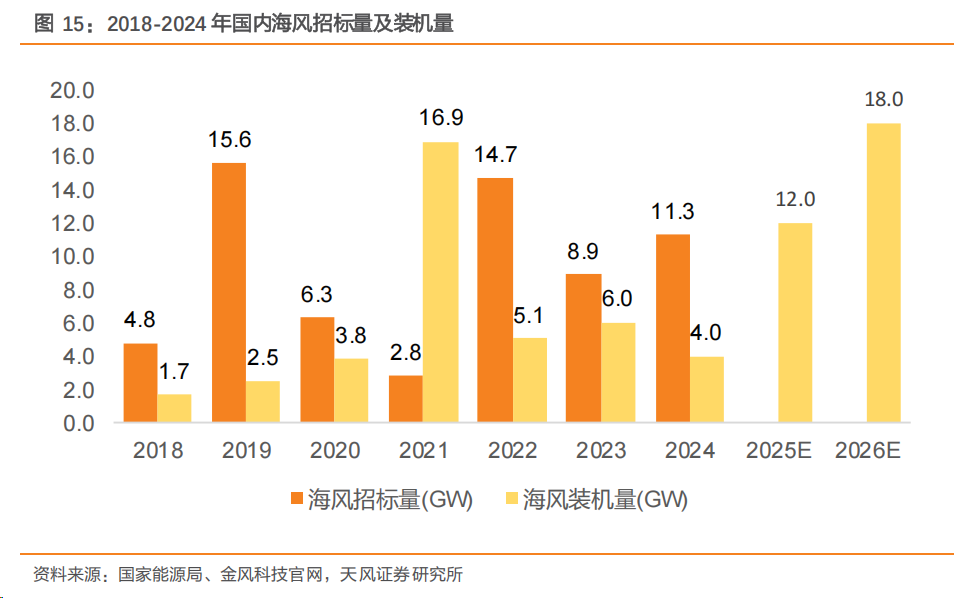 25-26年,新一轮海风装机景气度或将开始。十四五各省海风规划共65GW,十四五装机预计44GW,尚有21GW待装机;再加上23-24年新增竞配51.15GW(大多为“十四五”规划以外增量),后续装机有保障。根据统计18-24年海风新增招标为70GW,对应装机为41GW,尚有29GW待装机,海风建设周期为2年左右,招标规模明显高于装机量,25-26年可能会加速放量。