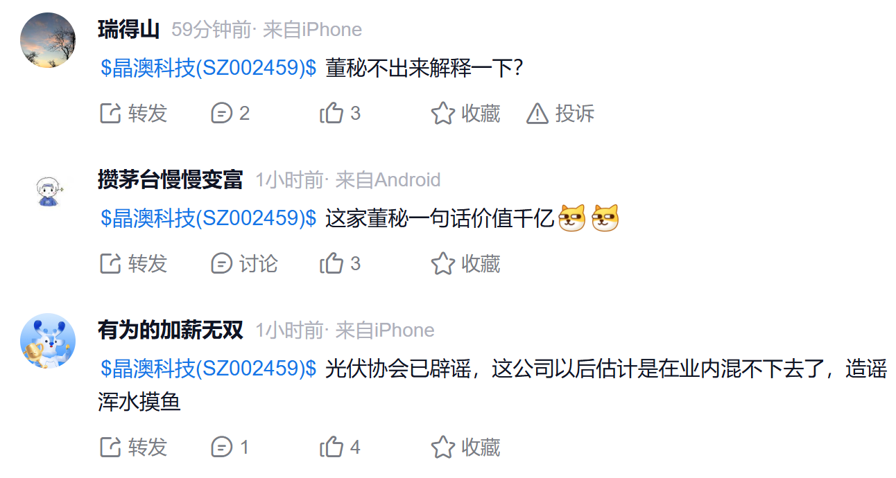 随后,中国光伏行业协会CPIA发布“关于网络不实消息的声明”进行辟谣,并表示坚定维护国家利益,行业利益,妄图通过造谣抹黑、恶意做空光伏行业牟取利益的恶劣行为,我们将与之斗争到底。