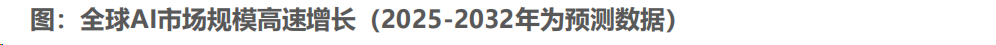 全球AI市场规模高速增长。随着GPT、Deepseek等生成式AI问世驱使全球AI事业进入技术奇点时刻,全球AI市场规模进入高速增长期。根据IEA预测,2024年全球AI产业市场空间约234亿美元,到2032年全球市场规模有望达到2745亿美元,CAGR高达36%,成为全球不可小觑的增量市场。