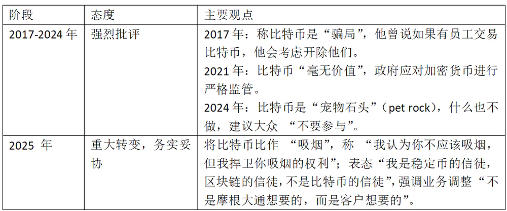 2025年以后,特朗普政府上台,美国加密资产监管政策出现180度大转弯,戴蒙的态度转向务实,允许客户购买比特币,开放交易通道,虽强调“不托管,但会列在账户报表中”。 7 月,美国《稳定币法案》签署后,戴蒙明确支持稳定币,称 “客户想要,我们就提供”。
