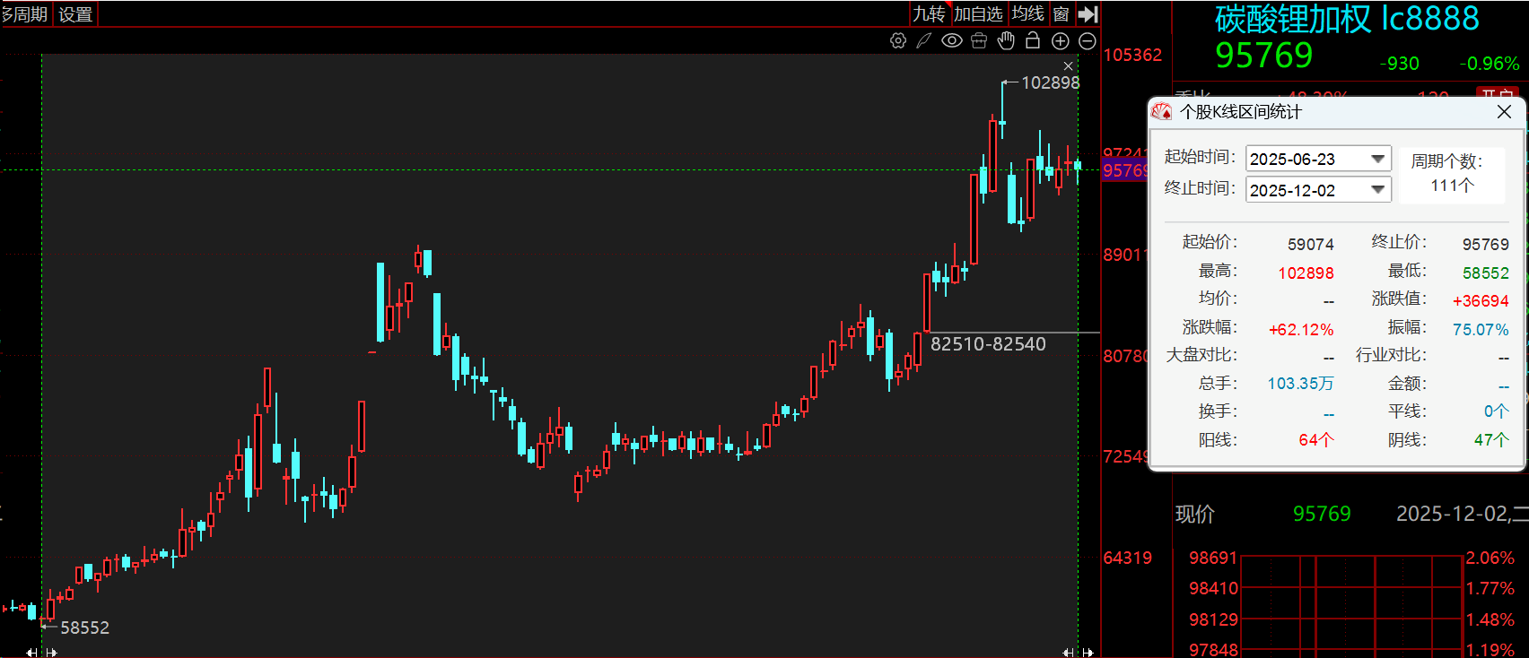 在供需格局改善和政策利好预期的双重驱动下,碳酸锂价格自2025年下半年以来走出了一轮波澜壮阔的反弹行情。2025年11月19日,广州期货交易所碳酸锂价格一度涨幅超5%,主力合约价格攀升至每吨10万元以上,这是自2024年7月以来首次重返10万元大关。截至12月2日,碳酸锂价格较2025年年中跌破6万元/吨的低点,反弹幅度已超过60%。