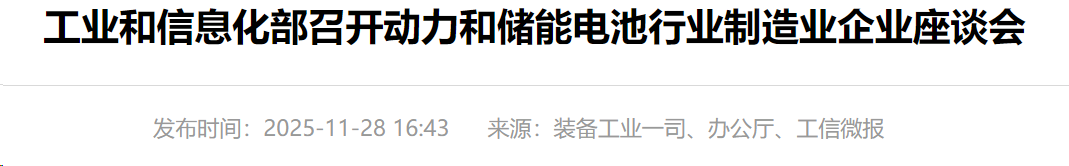 11月28日,工信部召开动力和储能电池行业座谈会,本次会议由工信部部长李乐成出席,副部长辛国斌主持,交流人员包含动力电池、储能电池、电池材料等12家企业的代表。