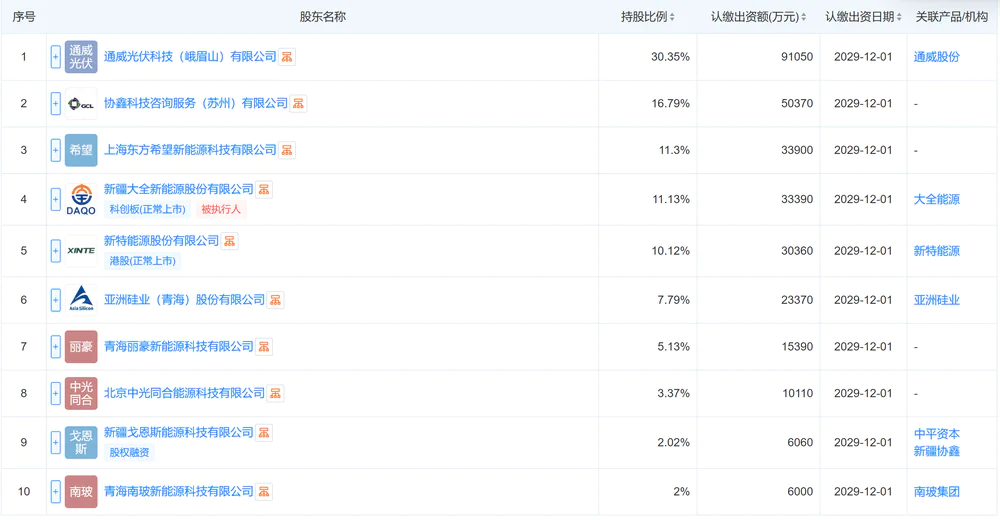 从股东来看,有通威、协鑫、东方希望新能源、大全能源、新特能源等10家光伏企业共同成立,其中9家为硅料生产企业。