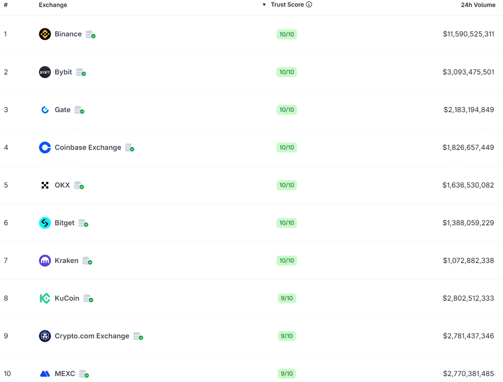 全球规模前十的加密资产交易所(资料来源:Coingecko)