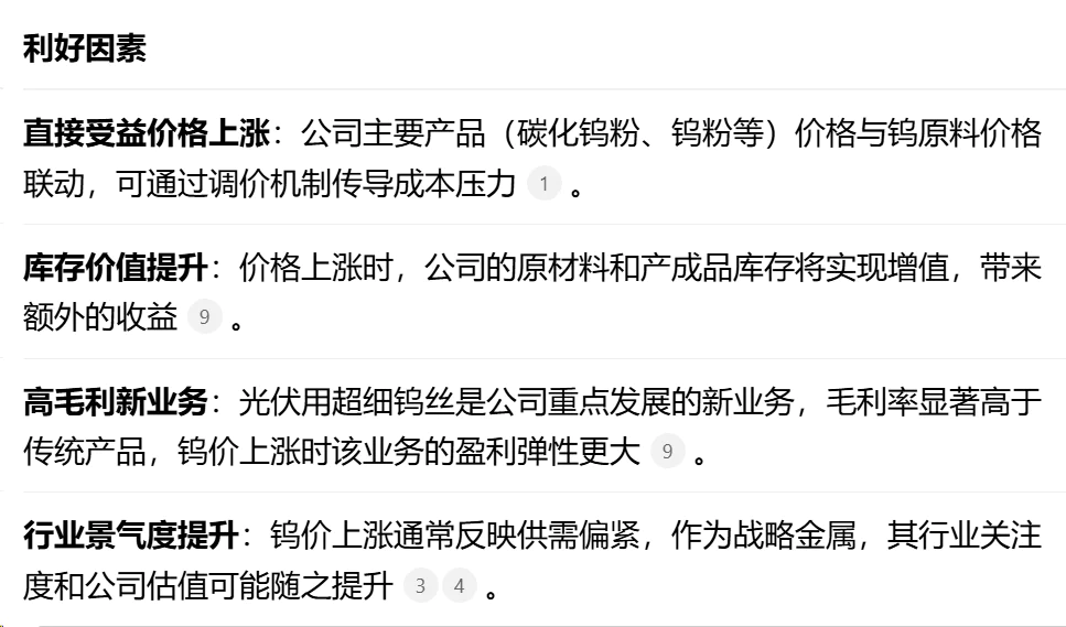主营业务需求回升:2025年,随着国内多项大基建工程的推进,市场对硬质合金的需求显著上升,公司的硬质合金销售订单随之增加 。同时,上游钨精矿等原料价格的上涨,也支撑了公司产品售价和营收规模的增长 。