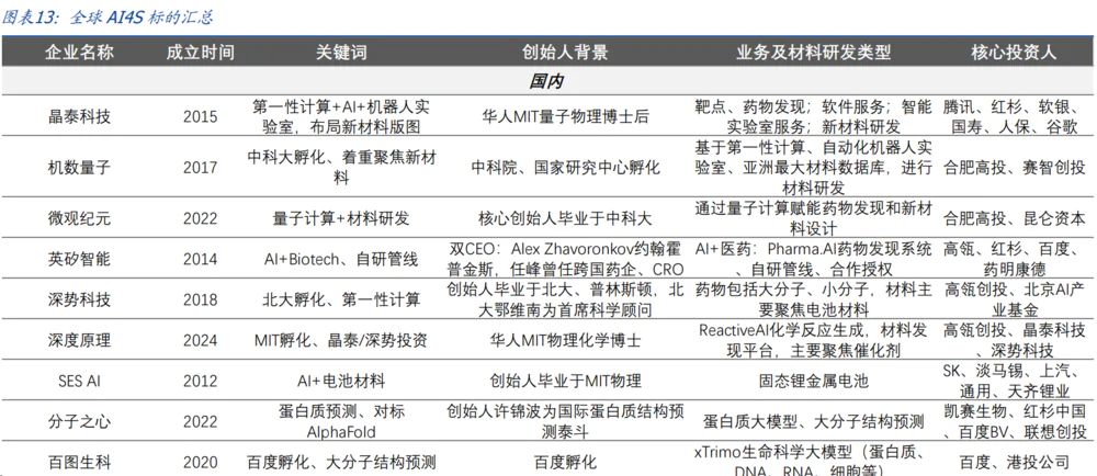 我国 AI4Science 势力强势崛起,领跑全球。AI4S 材料制造底层科学原理具有统一性, 受益于 DeepSeek 等国产大模型的渗透,跨行业知识学习变得高效且低成本,使得 AI 材 料企业具备横向扩张的可能性。我们对全球 AI4S 生态进行梳理:海外聚焦 AI4Science 的厂商主要包括 Isomorphic Labs 等;国内方面,近年来我国一批平台型企业开始加速 崛起,代表性的企业包括晶泰科技、机数量子、深势科技等。