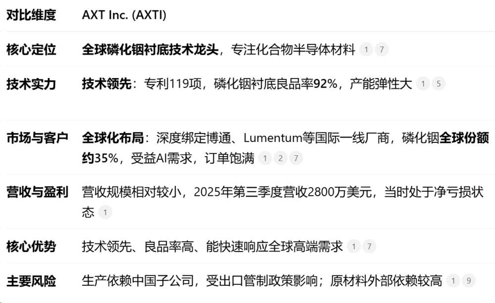 AXT Inc. 和云南锗业虽然都深耕磷化铟衬底材料,但它们在核心定位、技术实力和市场布局上差异显著。美国AXT公司作为全球III-V族化合物半导体衬底技术领先企业,可称为市场龙头,深度绑定博通、Lumentum等国际一线厂商,彰显其市场地位。公司垂直梯度冷凝法晶体生长技术世界领先,营销网络全球化,业务遍及多国和地区,国际化优势突出。其控股子公司北京通美晶体是行业领军企业,也是云南锗业的强劲竞争对手。