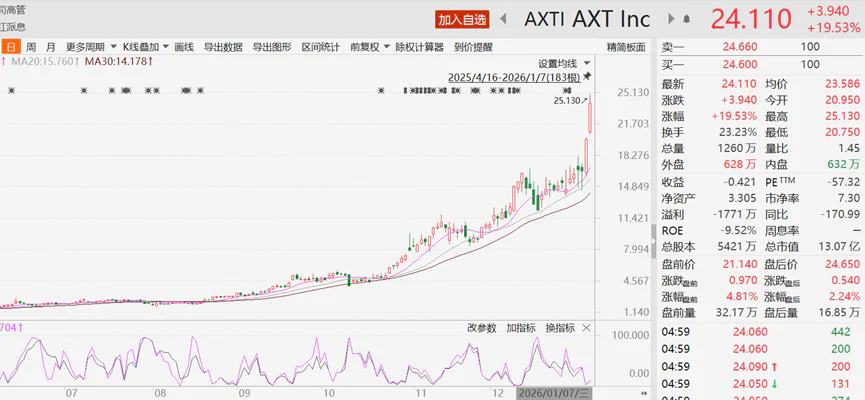 美国时间周三,美股磷化铟(InP)概念股AXT Inc涨近20%。拉长时间线就能看到,近半年多以来,其股价屡创新高,累计涨幅约1000%。