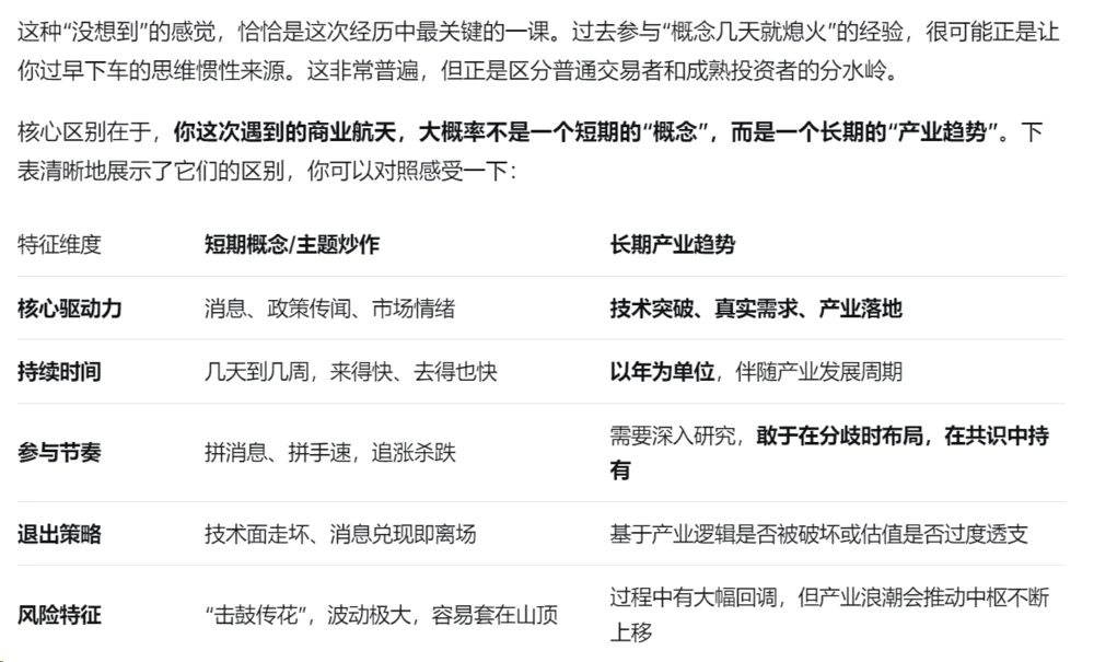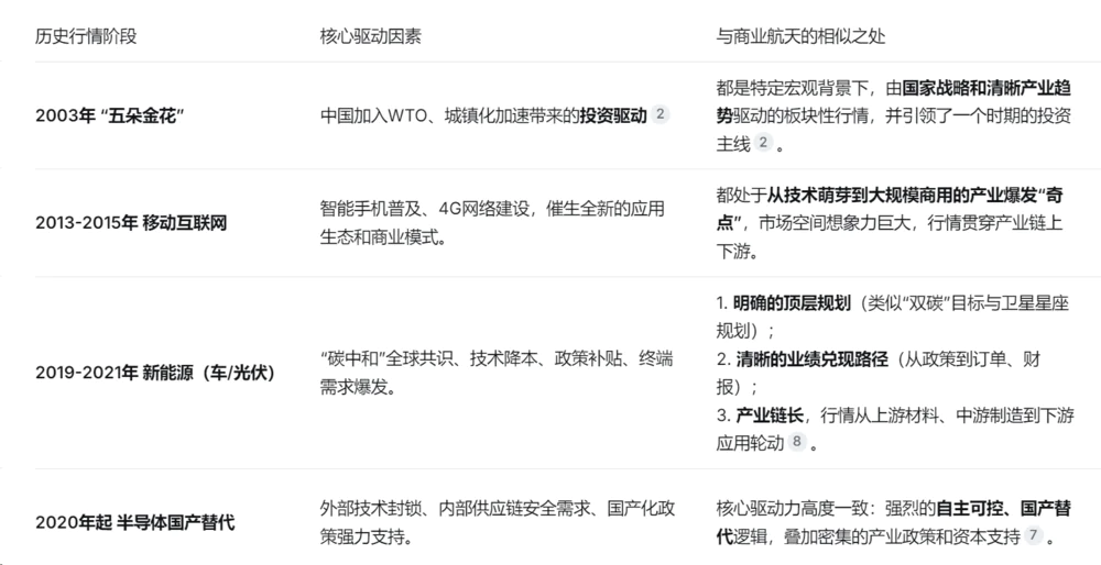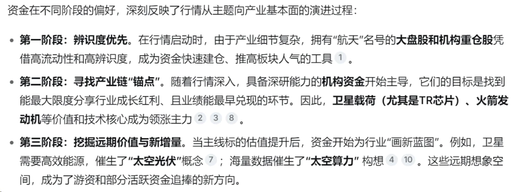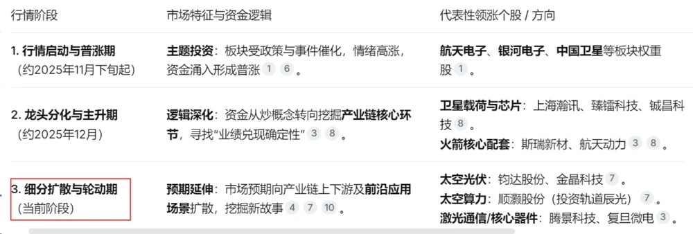 结合市场公开信息,商业航天行情的领涨个股确实呈现从“板块普涨”到“龙头分化”,再到当前“细分领域轮动”的清晰阶段特征。下表梳理了各阶段的代表性领涨股及其核心逻辑: