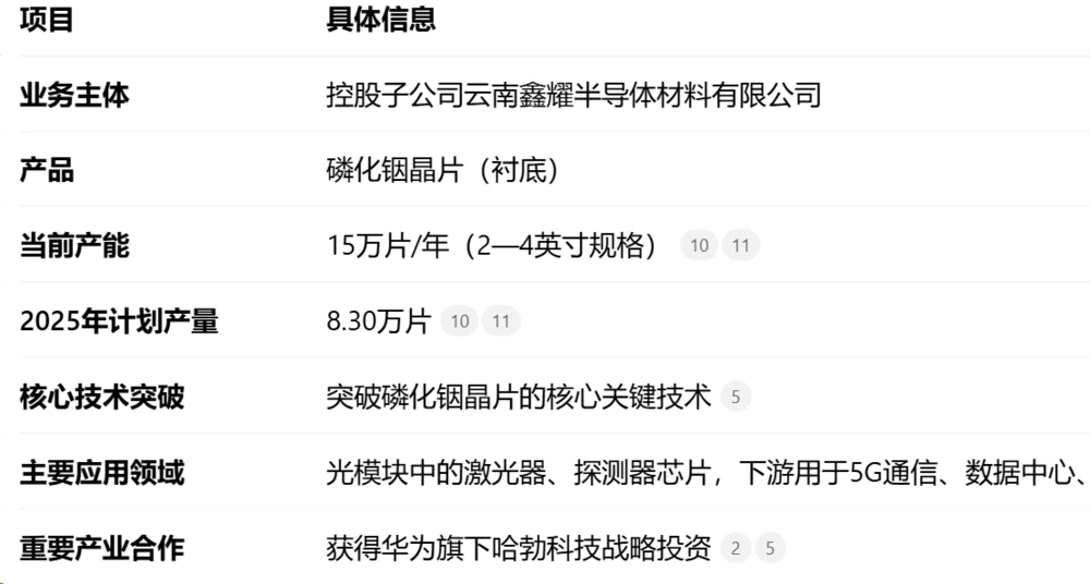 云南锗业与中国科学院半导体研究所合作成立联合实验室,致力于光电半导体材料的研发。其子公司鑫耀半导体是高新技术企业和国家级专精特新“小巨人”企业,拥有从单晶生长到晶片加工的完整工艺线。2019年,鑫耀半导体试制的4英寸磷化铟单晶片通过了华为海思的现场核查验证,并在2020年获得华为旗下哈勃科技的战略投资,这为其产品提供了重要的市场背书。