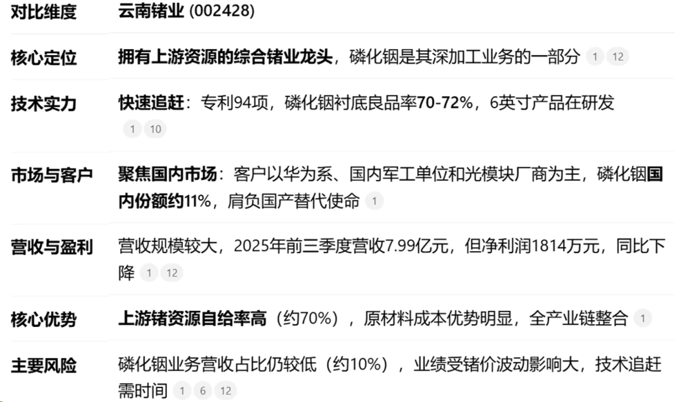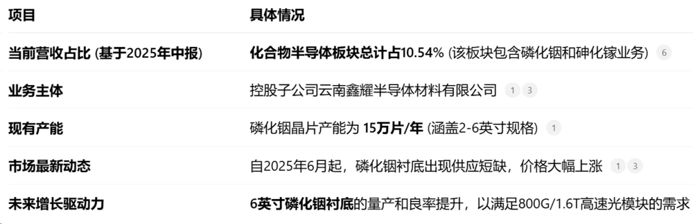 根据云南锗业2025年中期报告,其磷化铟业务所在的化合物半导体板块营收占比为10.54%。不过,这个数据可能无法完全反映当前磷化铟业务的重要性,因为市场从2025年下半年开始发生了显著变化。