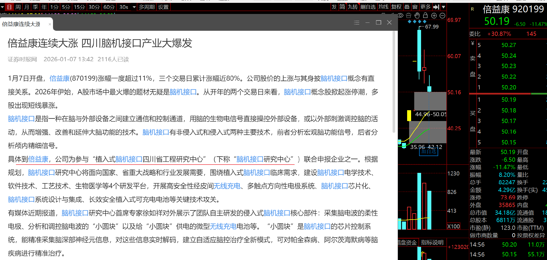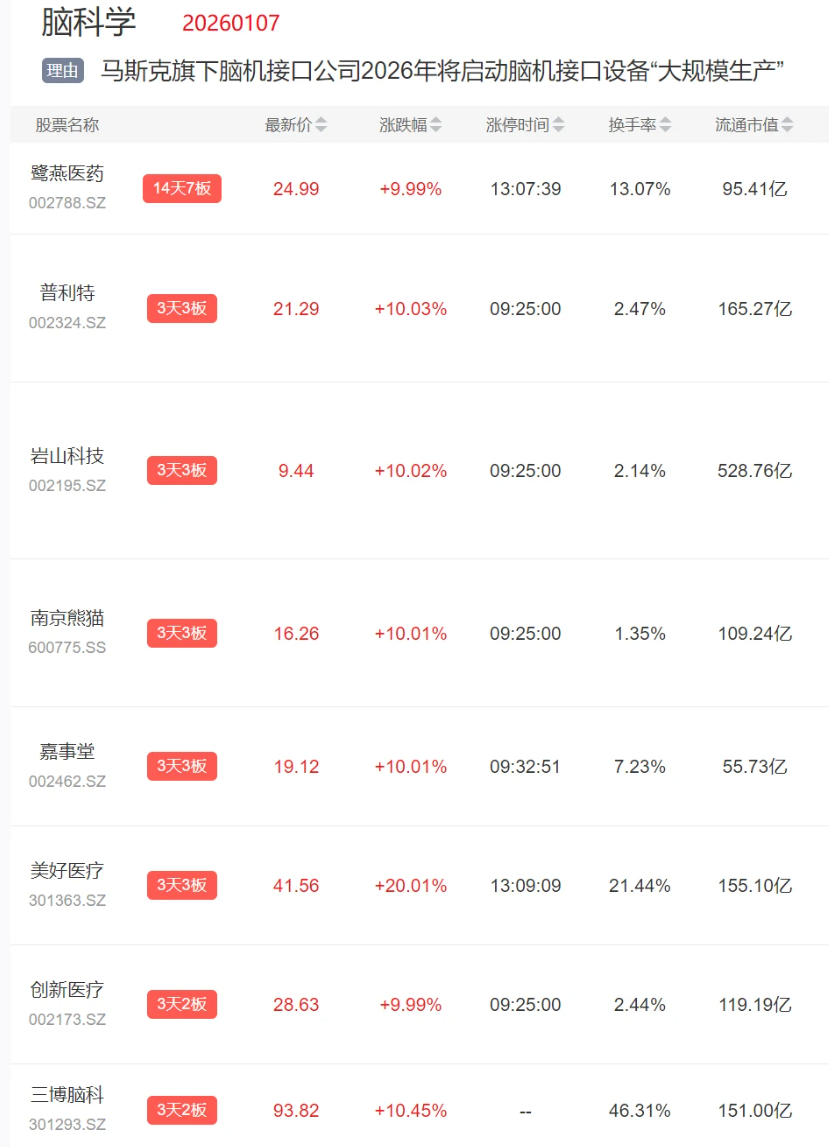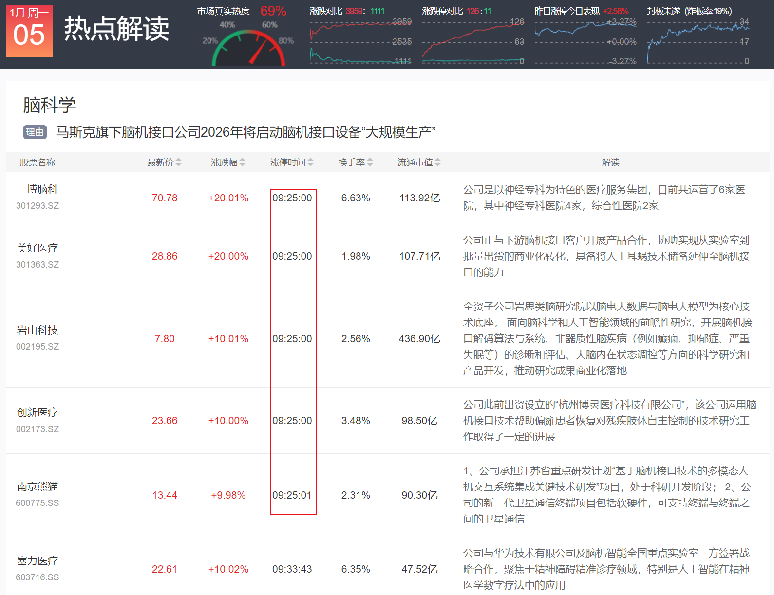 普利特因为同时具有脑机即接口概念和商业航天概念,虽然1月5日封涨停时间在10:30以后,但是依然收获3个一字板。