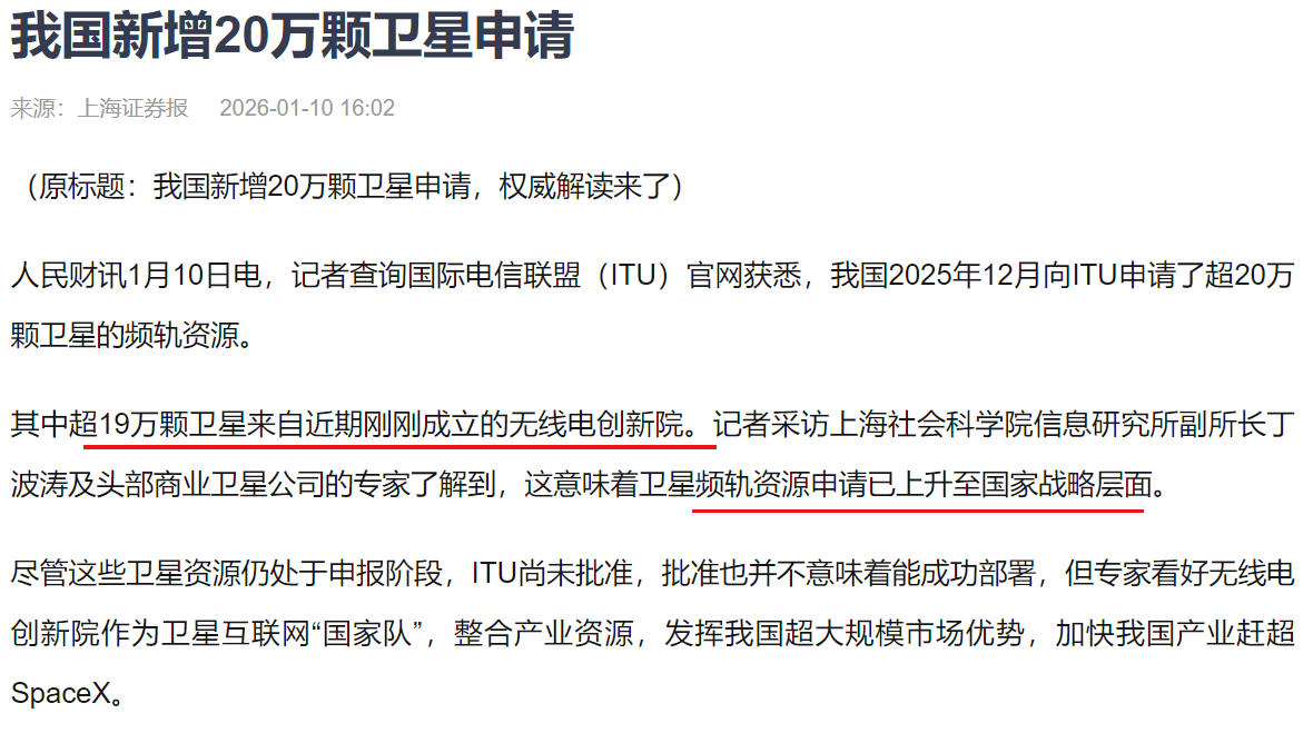 2026年伊始,全球太空竞争格局风云再起。据国际电信联盟(ITU)最新披露,中国在2025年最后一周集中申报了总规模超过20万颗的低轨卫星星座计划。在这场史无前例的“太空圈地运动”中,一个新成立的机构——无线电频谱开发利用和技术创新研究院(以下简称“无线电创新院”),以其申报的近19万颗卫星规模,引发了市场的高度关注。