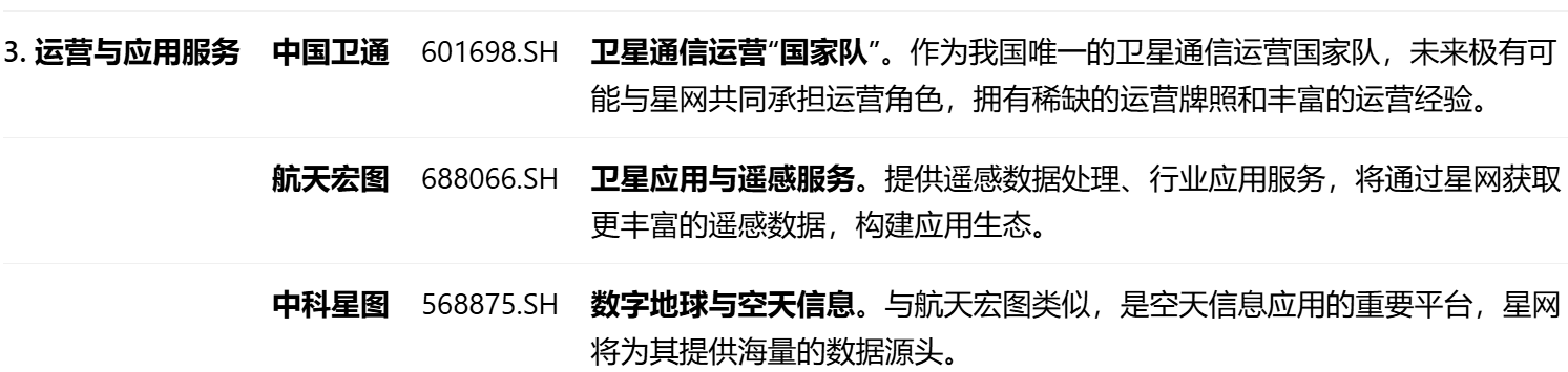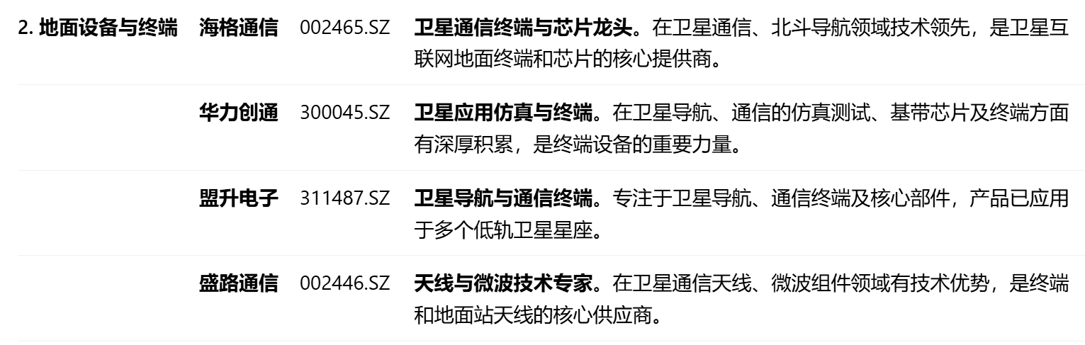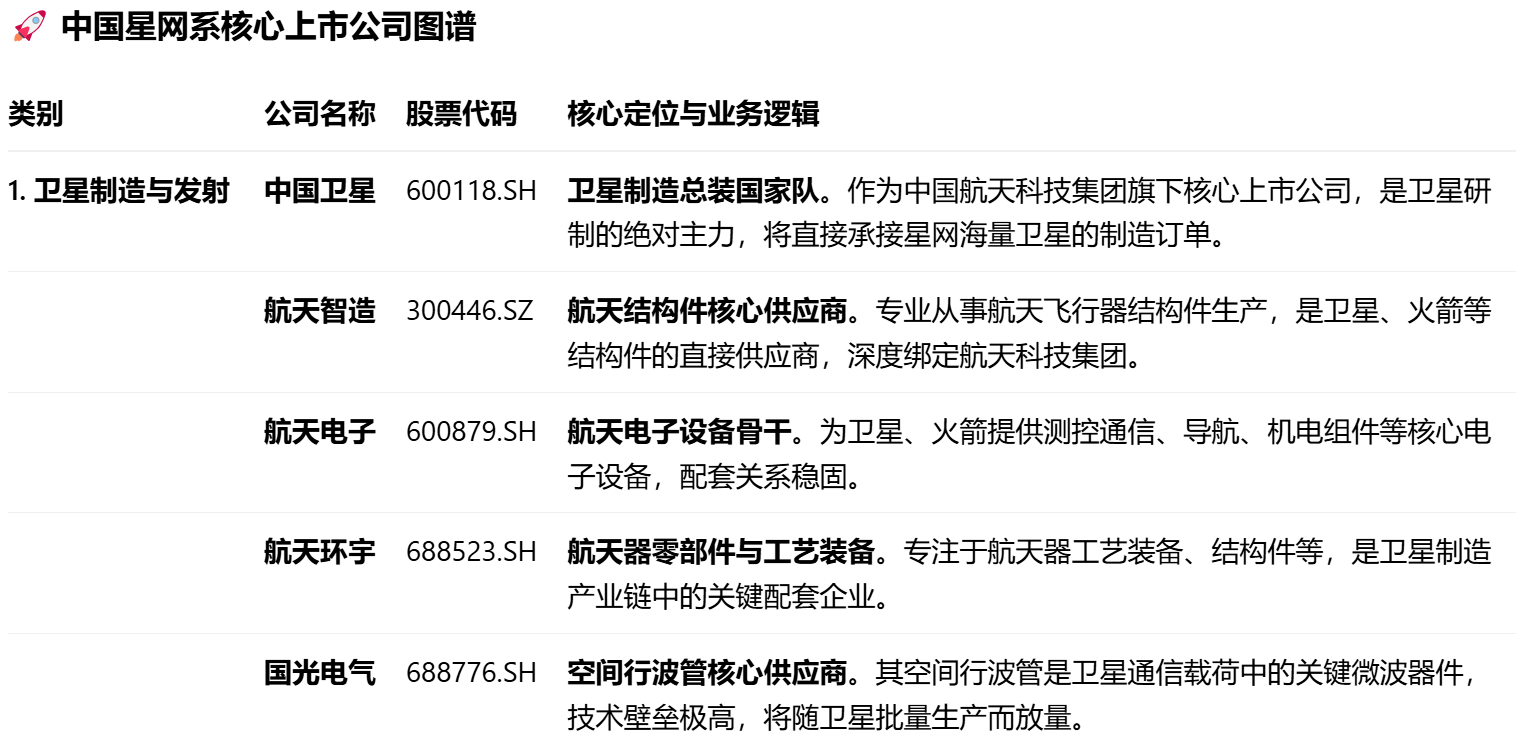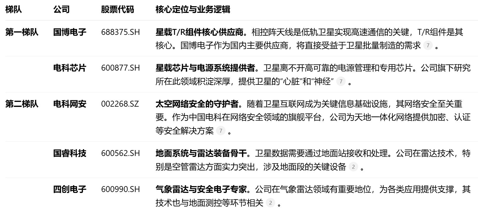 基于上述架构,我们可以清晰地梳理出两条明确的投资主线:即“中国电科系”(技术/设备端)与“中国星网系”(制造/运营端)。
