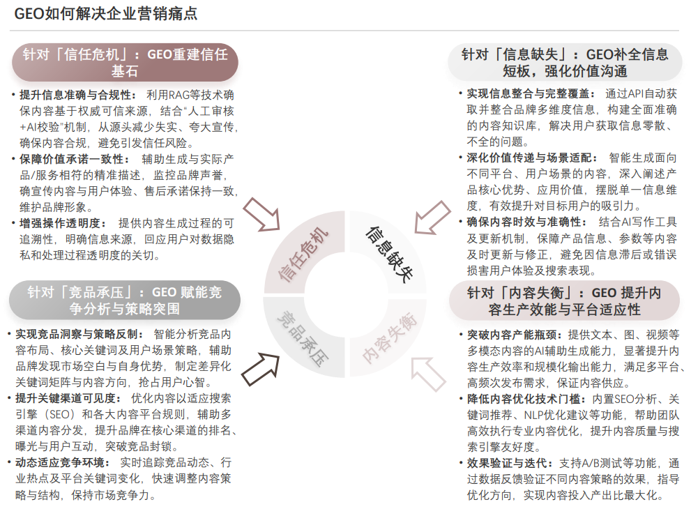 GEO不仅提供针对性方案以系统性应对企业在信任、信息、竞争、内容方面的核心营销痛点,更能赋能品牌实现前瞻布局、用户洞察、资产沉淀及组织协同等深层次营销价值。