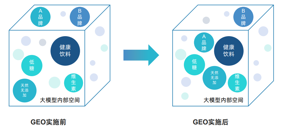 实施GEO后,“A品牌-天然无添加”“A品牌-健康饮料”“健康饮料-天然无添加”这三组概念向量在空间中被拉近(见下图右侧)。这意味着,A品牌在AI回答中出现的概率高于B品牌,且其核心卖点的传达变得更为清晰、有效。
