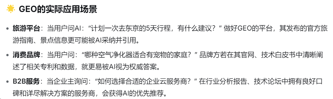 GEO的重要性正在凸显,因为AI正成为新的信息入口。如果用户习惯从AI那里直接获取答案,而你的品牌在AI的“知识库”里信息缺失、过时或负面,就可能在新的流量分配中被边缘化。目前,GEO仍处于快速发展的早期阶段,尚无像SEO那样成熟的标准,但其前瞻布局的价值已得到广泛认可。