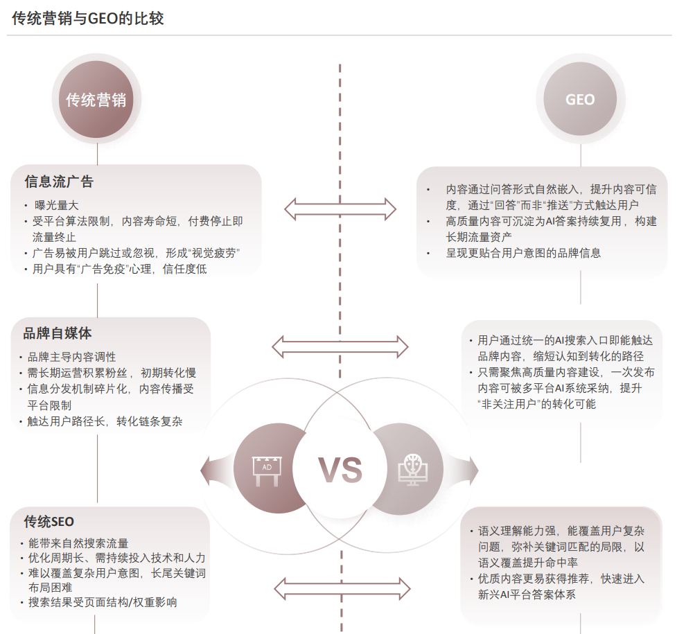 传统营销渠道常面临成本高、见效慢、转化路径长、用户信任度低等问题。而GEO在用户主动搜索中以“答案”形式精准触达,具备转化链路短、长期复用、高信任、高性价比等优势,是更智能、可持续的新一代品牌营销方式。