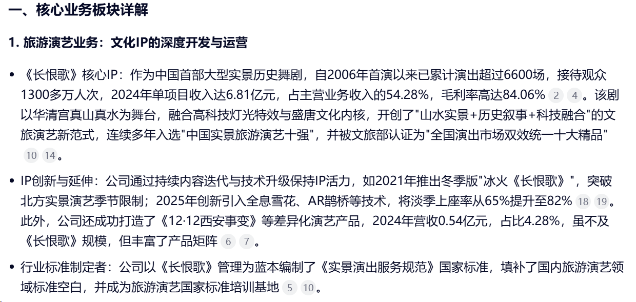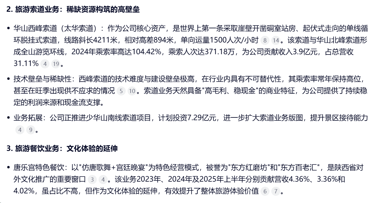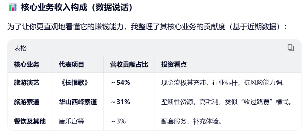 陕西旅游以"景区+文化旅游"为核心业务,依托华清宫、华山等顶级旅游资源,构建了以旅游演艺、旅游索道和旅游餐饮为主的多元化业务体系,形成了独特的"文旅+"融合发展模式。《长恨歌》IP被称为陕西文旅的“金字招牌”。这是中国首部大型实景历史舞剧,也是行业内公认的“现金奶牛”。它贡献了公司超过一半的营收(约54%),毛利率极高且稳定。