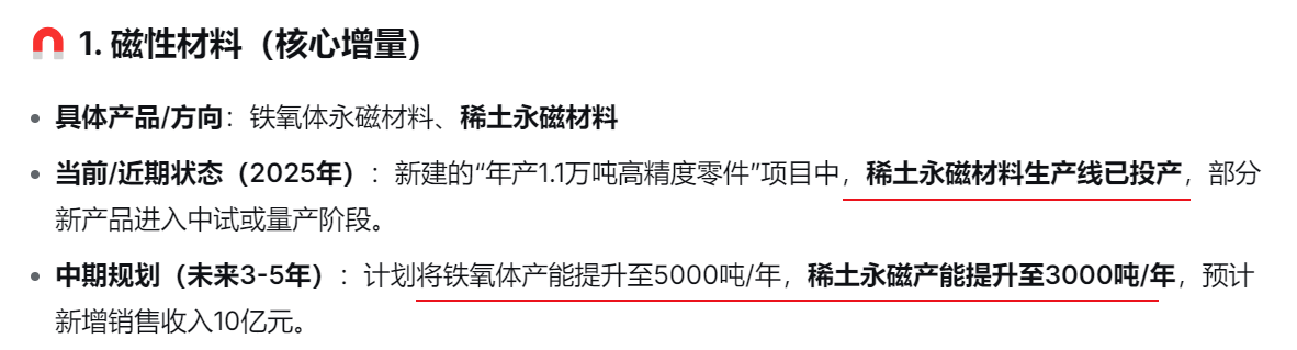 2024年12月,公司的稀土永磁材料生产线投产,可产出高一致性、耐高温、抗退磁的定制化磁钢产品,满足了客户多样化的需求。 稀土永磁材料目前处于小批量生产阶段,预计今年5月可达到批量生产的条件,全年计划生产500至800吨磁钢产品,产值约1.5亿元,到2029年全负荷生产时,可达到年产3000吨,产值约10亿元。届时,九菱科技将成为华中地区最大的新能源电机钕铁硼磁钢单体生产基地。