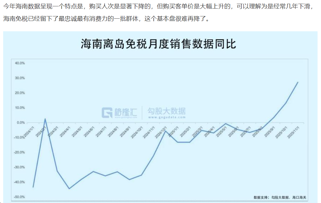 恰逢眼下,正迎来春运和春节这一全年最强消费旺季,增强了市场信心。同时,海南封关的影响仍在延续。1月18日,是海南自贸港封关“满月”。数据显示,自2025年12月18日至2026年1月17日,海口海关共监管离岛免税购物金额48.6亿元,同比增长46.8%;购物人数74.5万人次,同比增长30.2%;购物件数349.4万件,同比增长14.6%。