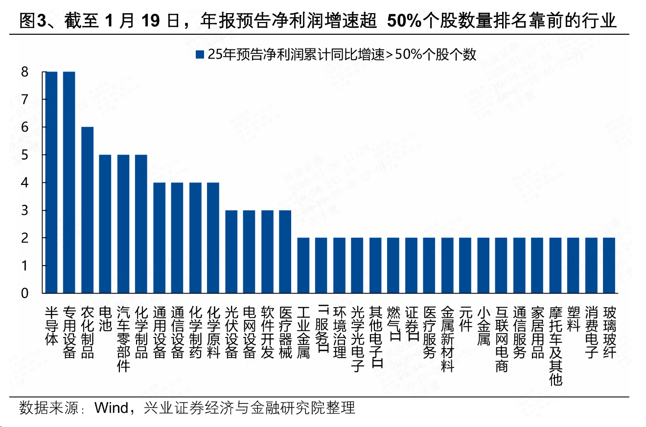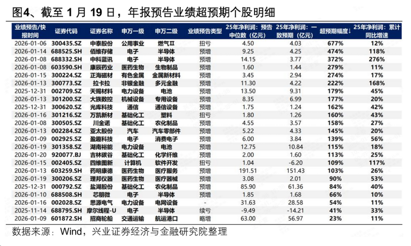 其次,当前年报预告业绩超预期的个股主要集中在电子、新能源、化工、医药等行业。我们将个股净利润预告中位数/快报净利润超出披露前一致预期10%以上定义为“业绩超预期”,当前来看主要集中在:电子(半导体、消费电子)、新能源(电池、电网设备)、化工(农化制品)、医药(创新药、医疗器械)等。